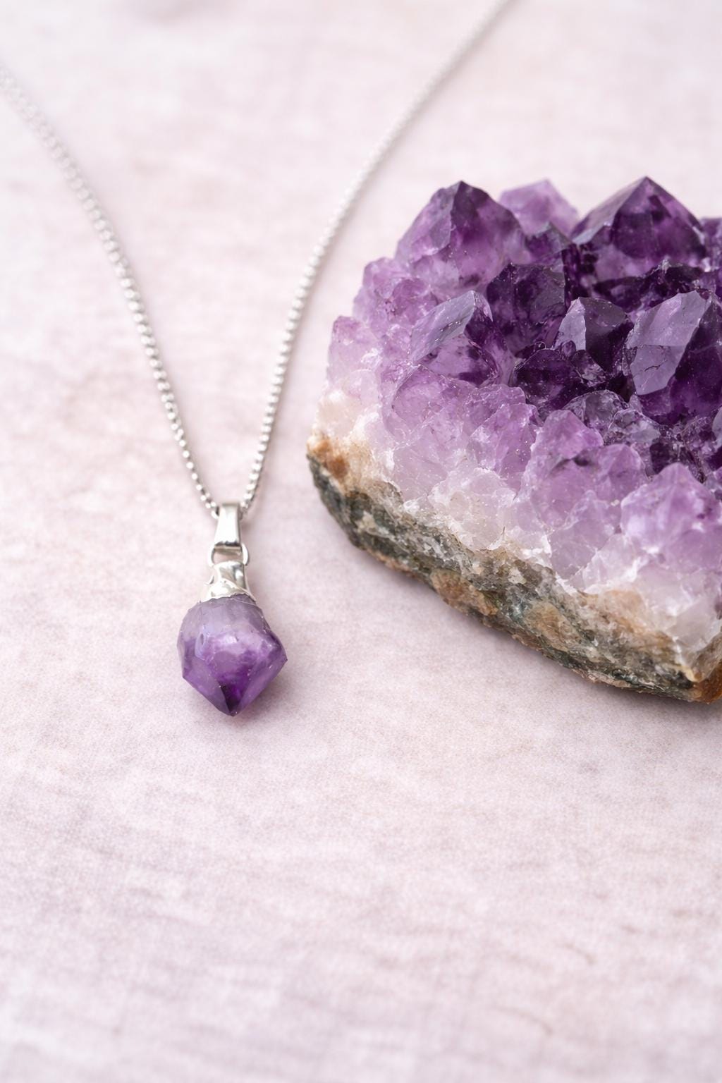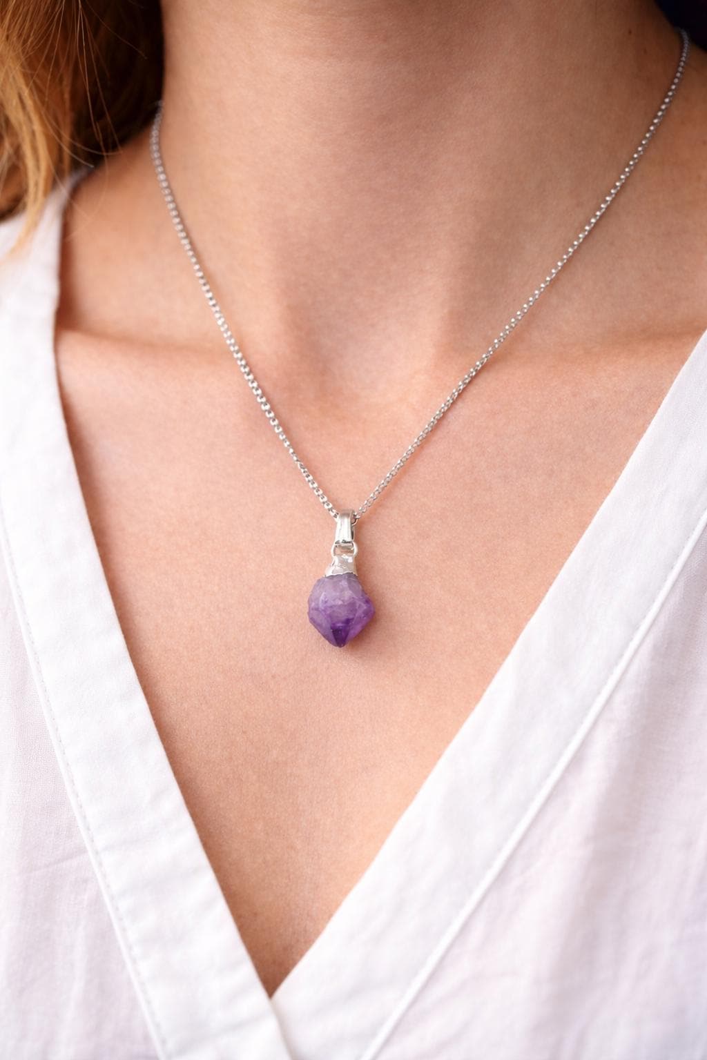 A raw amethyst crystal necklace designed to support calm, balance, and positive energy. Featuring a natural unpolished gemstone pendant, this minimalist piece blends spiritual meaning with everyday elegance, making it perfect for mindful living and inner harmony.